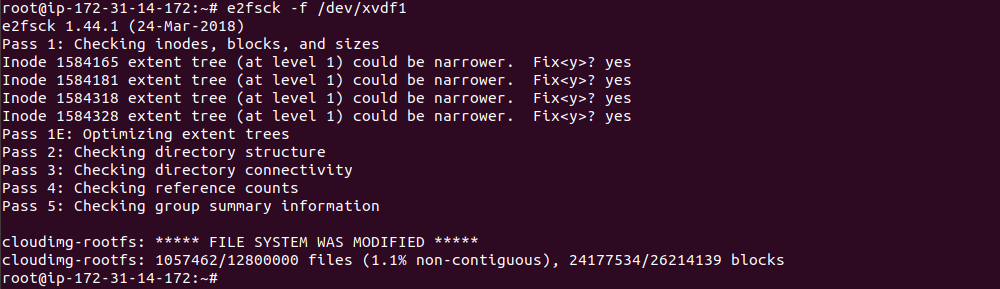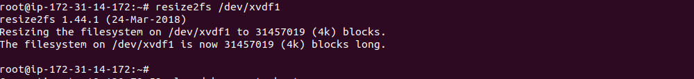 If any errors found, you will be asked to press “y” to fix the errors. After e2fsck run, you can reszie filesystem with command