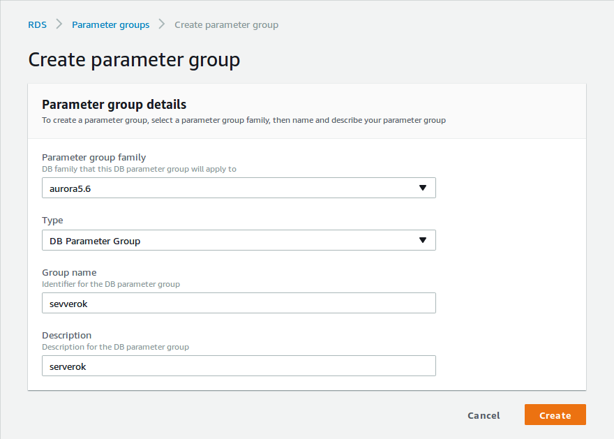 On next page, select “Parameter group family” based on what ever RDS version you are using. In this cause i use Amazon Aurora database, so i select “aurora5.6”