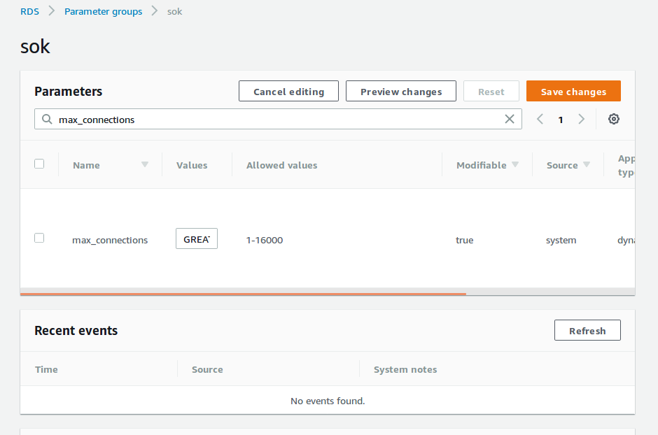 Once created, it will list all available parameter groups. click on newly created parameter group, on next page, it show all options. In the top search box, type in “max_connections” to find the settings. Edit and save.