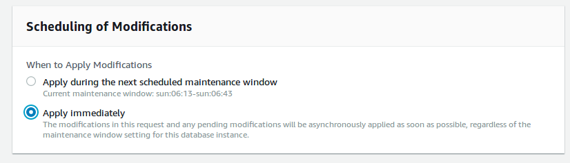 On next page, you have option to apply change immediately or apply during maintenance window.
