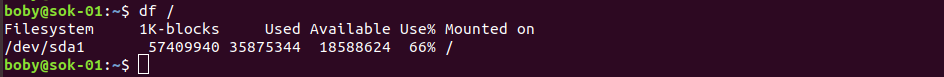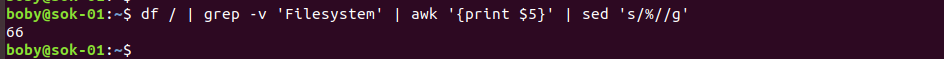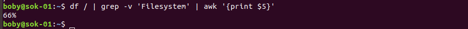 From the result, we only need the Use% part. In this case 66%, to find this, you can use awk command, that split the line, then prient specified part. In our case, we need 5th part.