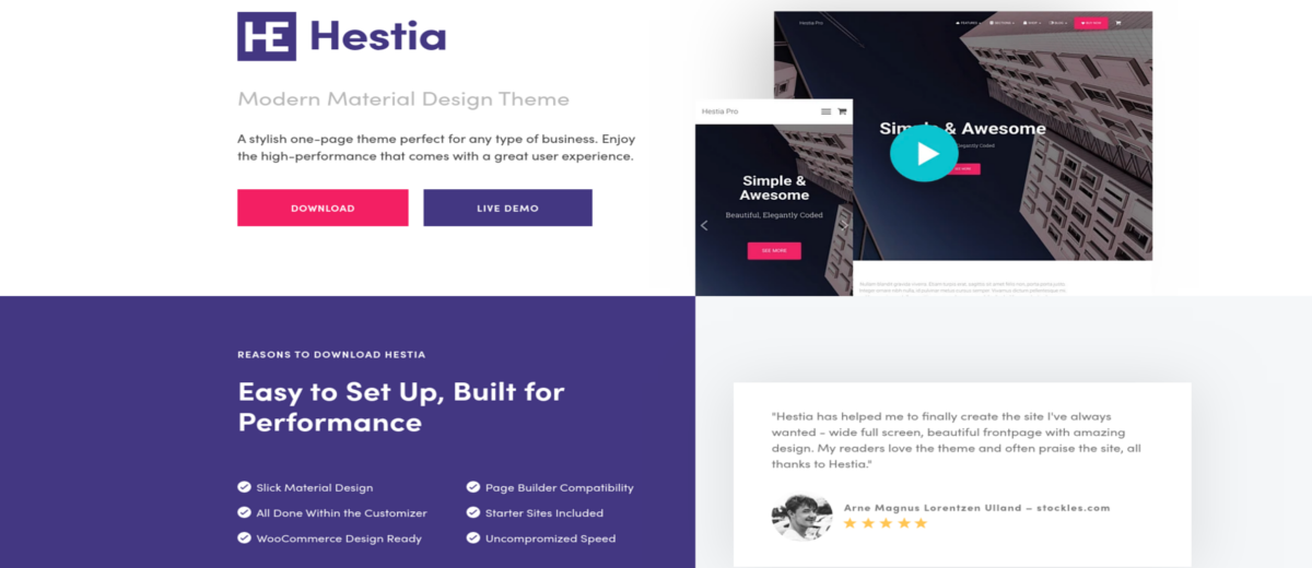 Hestia is a stylish and modern one-page theme that’s flexible for any type of website. It has a focus on speed and performance so your website will load quickly.