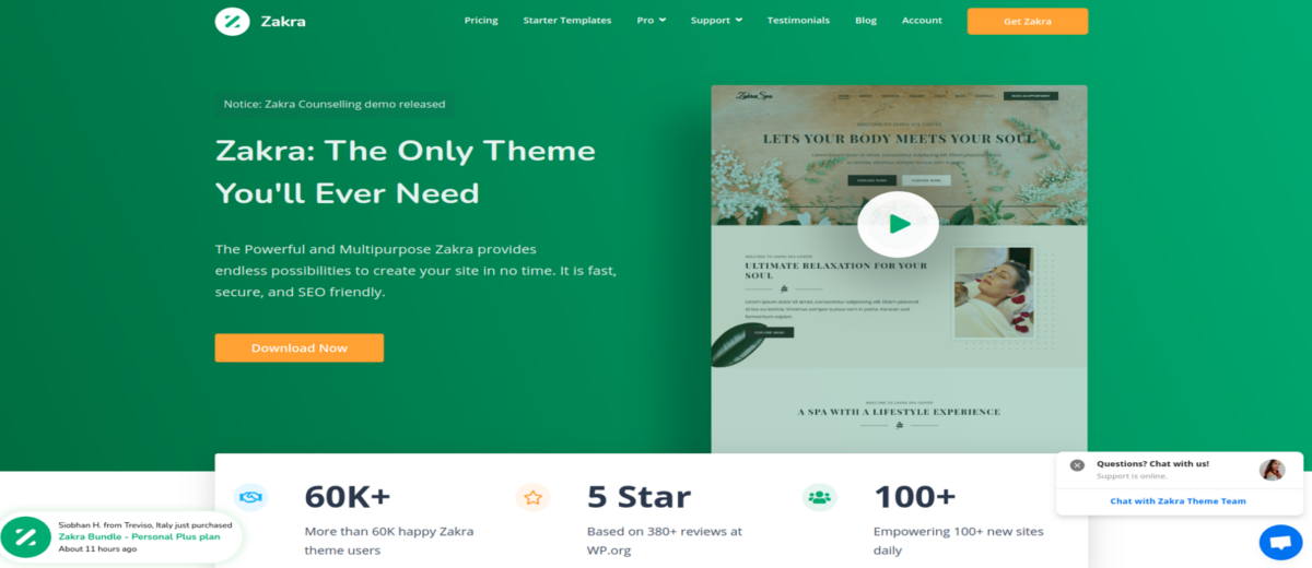 Zakra is one of the best free WordPress themes available built with optimal performance and fast speed in mind. Combining impactful visuals alongside a feature-rich dashboard, this theme is sure to leave your visitors impressed.