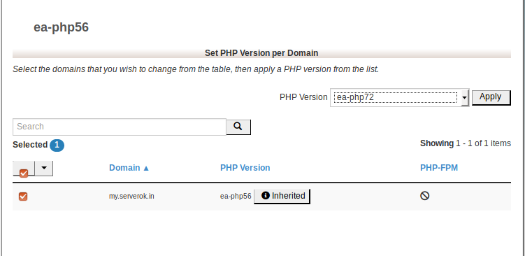 On this page, click the checkbox right side of your domain name. From “PHP Version” drop down, select the PHP version you need. Click Apply. Now your site have selected PHP version.