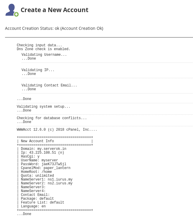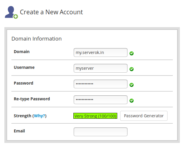 On “Create a New Account” page, you need to enter your domain name. User name will be auto generated. Click “Password Generator” to generate secure password. Make sure you copy this password as you need it later for login to Cpanel/FTP.