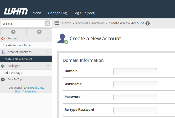 You can also use the search box on left top side of WHM. Search for “create”, then click on “Create a New Account” link.