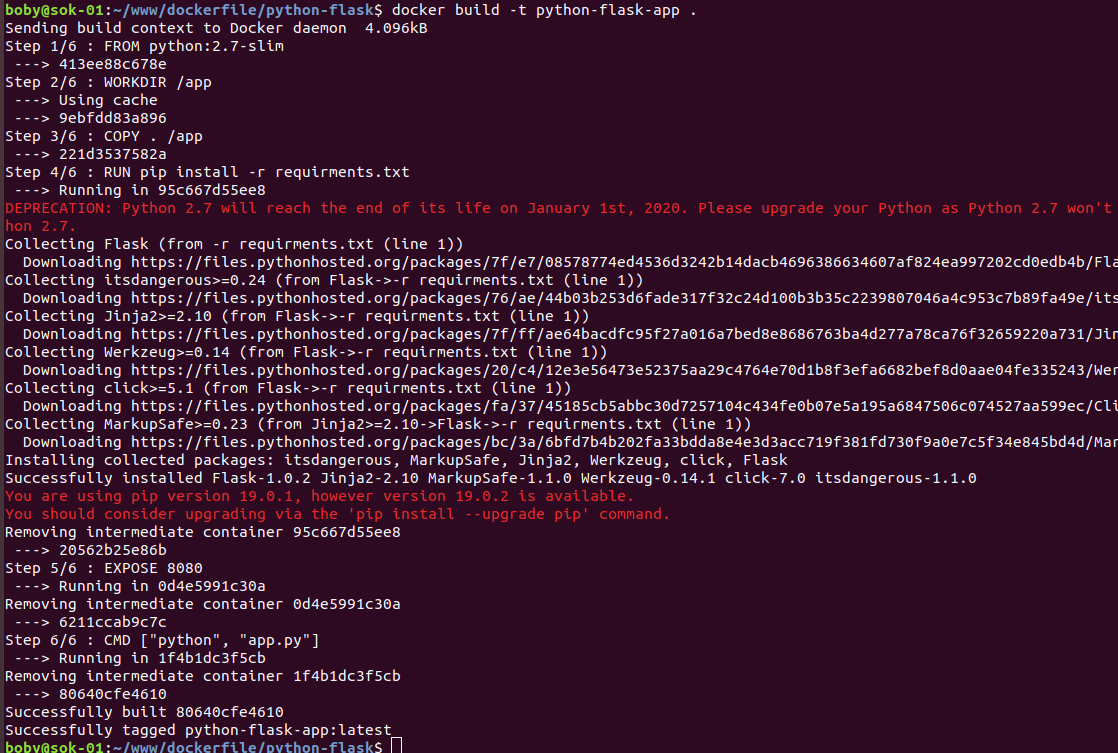 FROM python:2.7-slim WORKDIR /app COPY . /app RUN pip install -r requirements.txt EXPOSE 8080 CMD ["python", "app.py"]