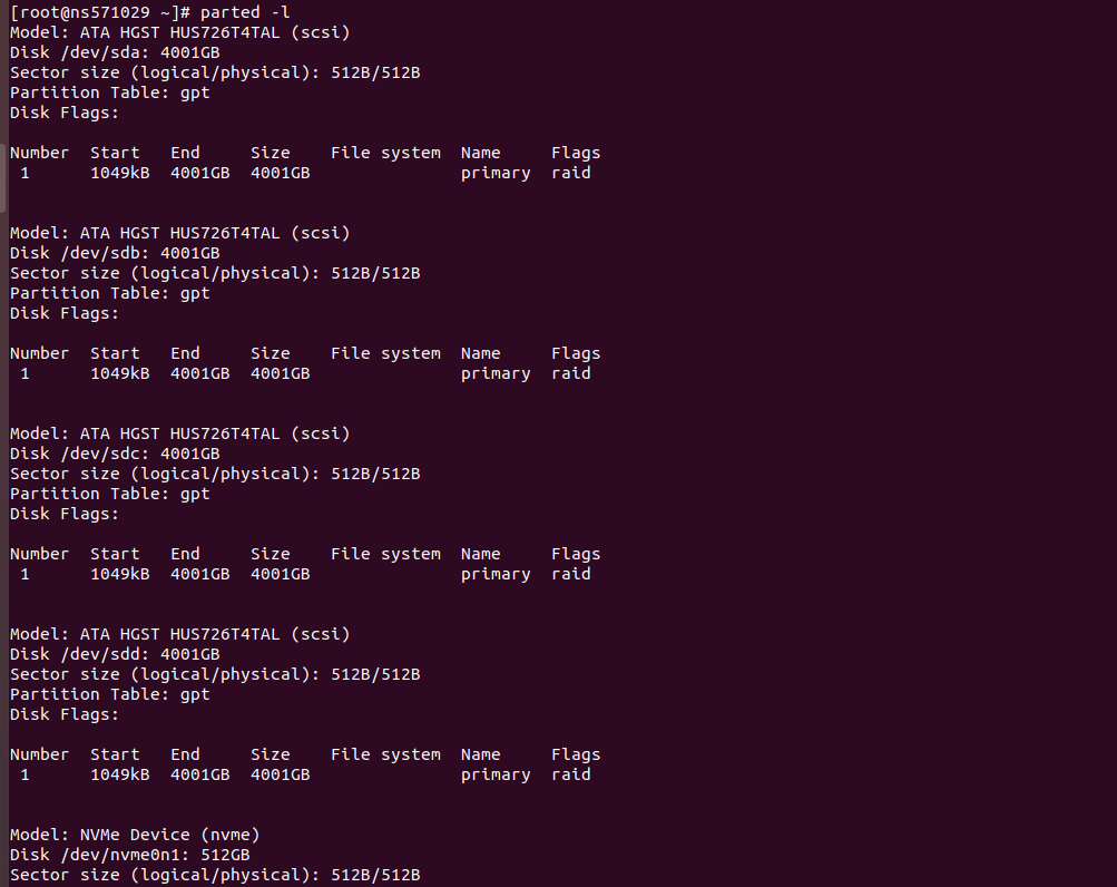 I have a server with 4 * 4 TB Disks. Here is parted -l result on the server.
