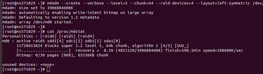 mdadm --create --verbose --level=5 --chunk=64 --raid-devices=4 --layout=left-symmetric /dev/md0 /dev/sda1 /dev/sdb1 /dev/sdc1 /dev/sdd1