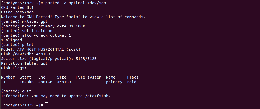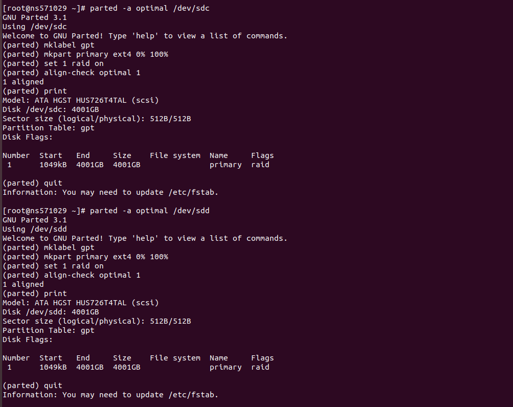 parted -a optimal /dev/sda mklabel gpt mkpart primary ext4 0% 100% set 1 raid on align-check optimal 1 print quit