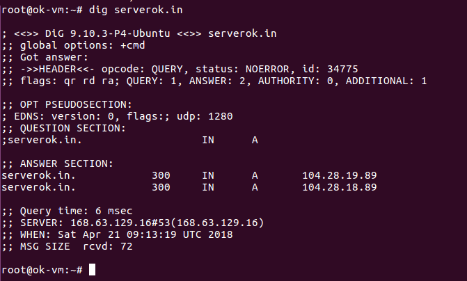 root@ok-vm:~# dig +short serverok.in 104.28.18.89 104.28.19.89 root@ok-vm:~#