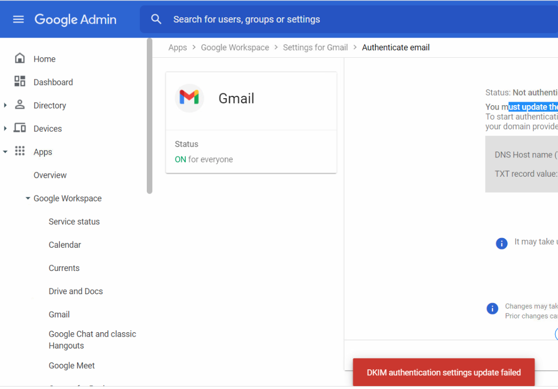 DKIM authentication settings failed