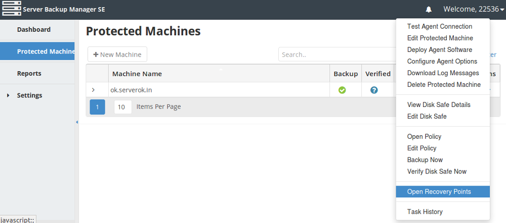 To restore backup, login to R1Soft Server Backup Manager. Go to Protected Machines. This page will list all available servers.