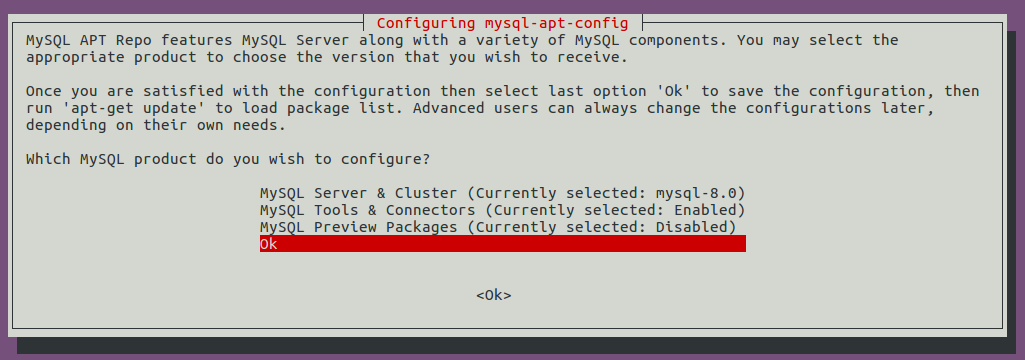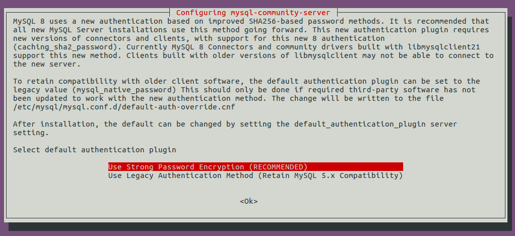 It ask you to select MySQL version, default is 8, just press down arrow and select “Ok”.