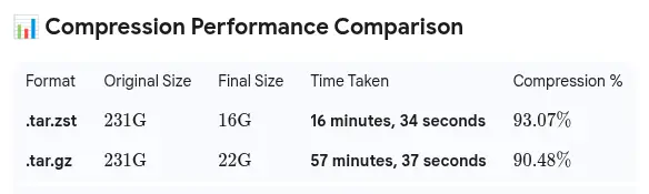 I compressed a folder with 231G files. Here is the result. tar.zst take only 16 minutes. tar.gz take 57 minutes. tar.zst file is 6 GB smaller.